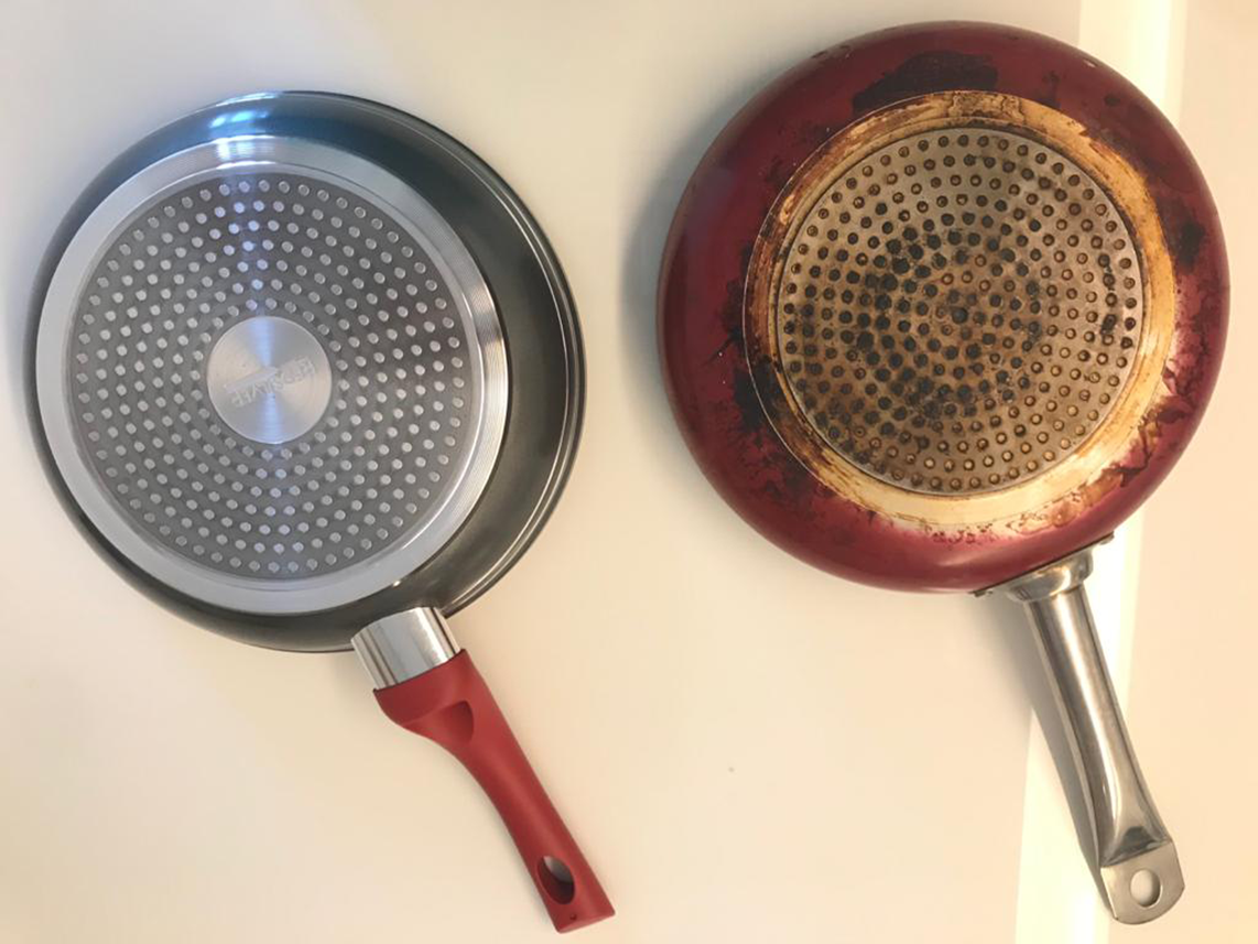 De todos os nossos testes, esse foi o principal, pois o grande diferencial dessas panelas é o fato de não precisarem de óleo. Nós fizemos o teste fritando um ovo sem usar óleo na RedSilver e comparamos com uma panela comum. A diferença foi gritante. Com a RedSilver o ovo deslizava na panela e realmente não grudou nada, enquanto que na panela comum, o ovo grudou bastante, como pode ser visto na imagem abaixo: